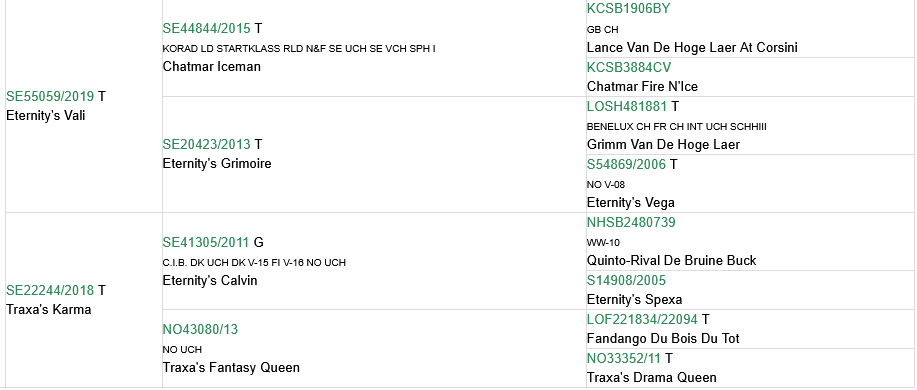 Resultat: Genomförd mentalbeskrivning. Excellent, CK, BIS, Nordic cert x1, res-Nordic cert x2, CACIB x1.